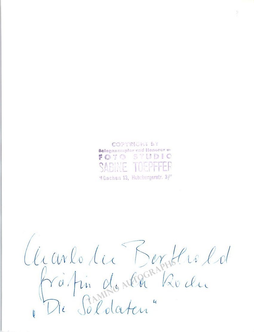 Signed photograph, shown in role in Bernd Alois Zimmermann's Die Soldaten, signature on verso. Stamped on verso by photographer Sabine Toepffer, Munich. Size is 7.25 x 9.5 inches, in excellent condition.