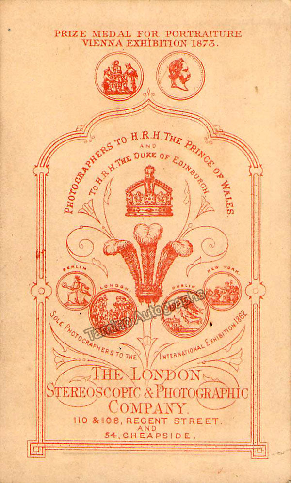 Autograph letter signed, 2 pages of a folded 4 page document, written in English. Size of each page is 4.5 x 7 inches, some mounting traces (scotch tape) on left side of the paper, otherwise in excellent condition. Also included: Unsigned Carte-de-Visite (CDV) photo of her, shown as herself taken by the London Stereoscope and Photographic Company, 2.5 x 4 inches, beautiful item in excellent condition. Not sold separately.
