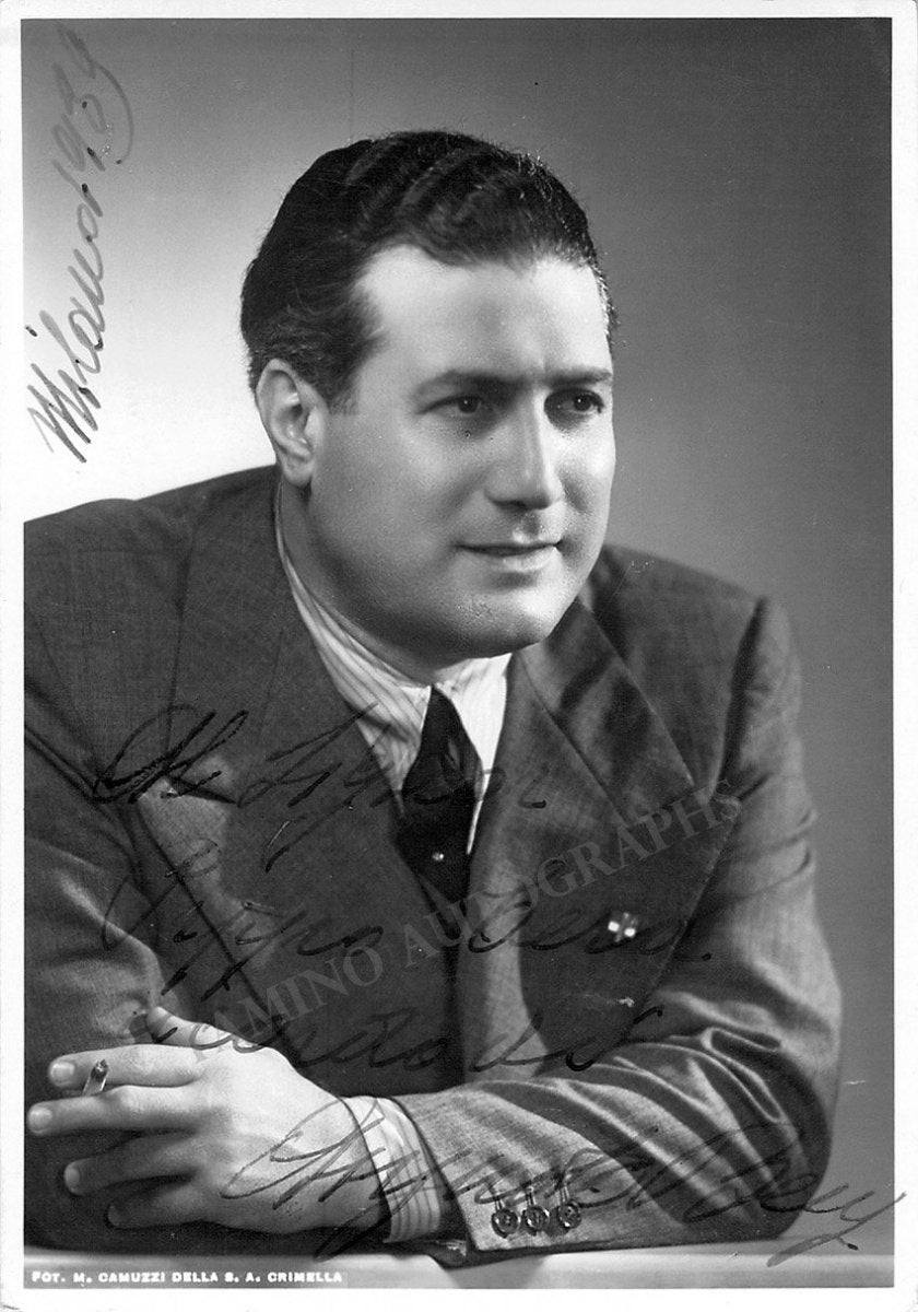 Italian baritone and later bass (1887-1969), signed photo, shown as himself, signed in Milan, dated 1939. Inscribed. Photo by M. Camuzzi, Milan. Size is 4 x 5.75 inches, slight creases on bottom left and right but otherwise in excellent condition.