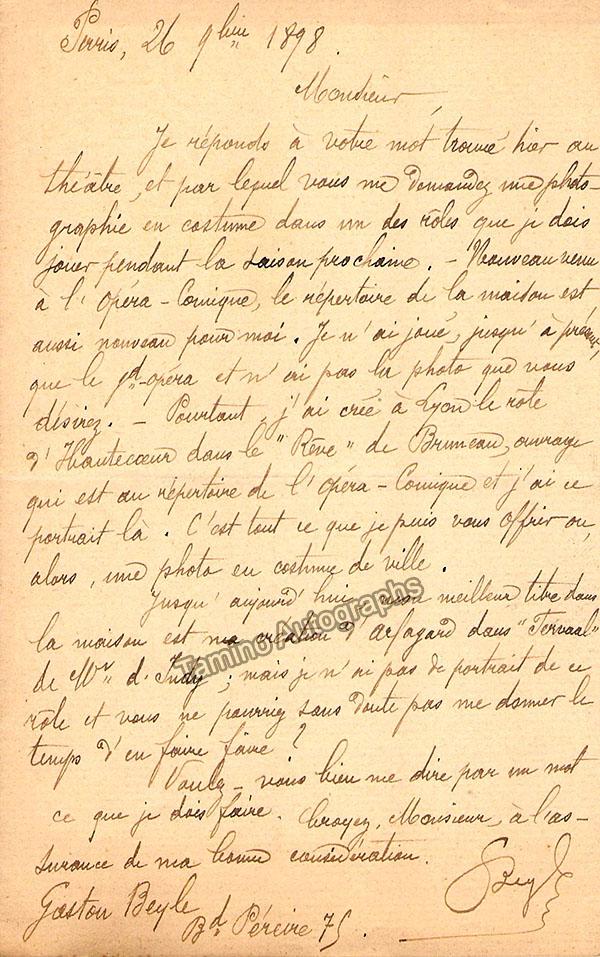 Autograph letter signed, dated in 1898. 1 page, size is 4.5 x 7 inches, in excellent condition. Written in French, sold untranslated. ALSO INCLUDED: 1 black and white photo postcard, shown in the title role of Massenet's Werther, with printed inscription and signature. Photo by P. Berger. Size is 3.5 x 5.5 inches, in excellent condition. Not sold separately.
