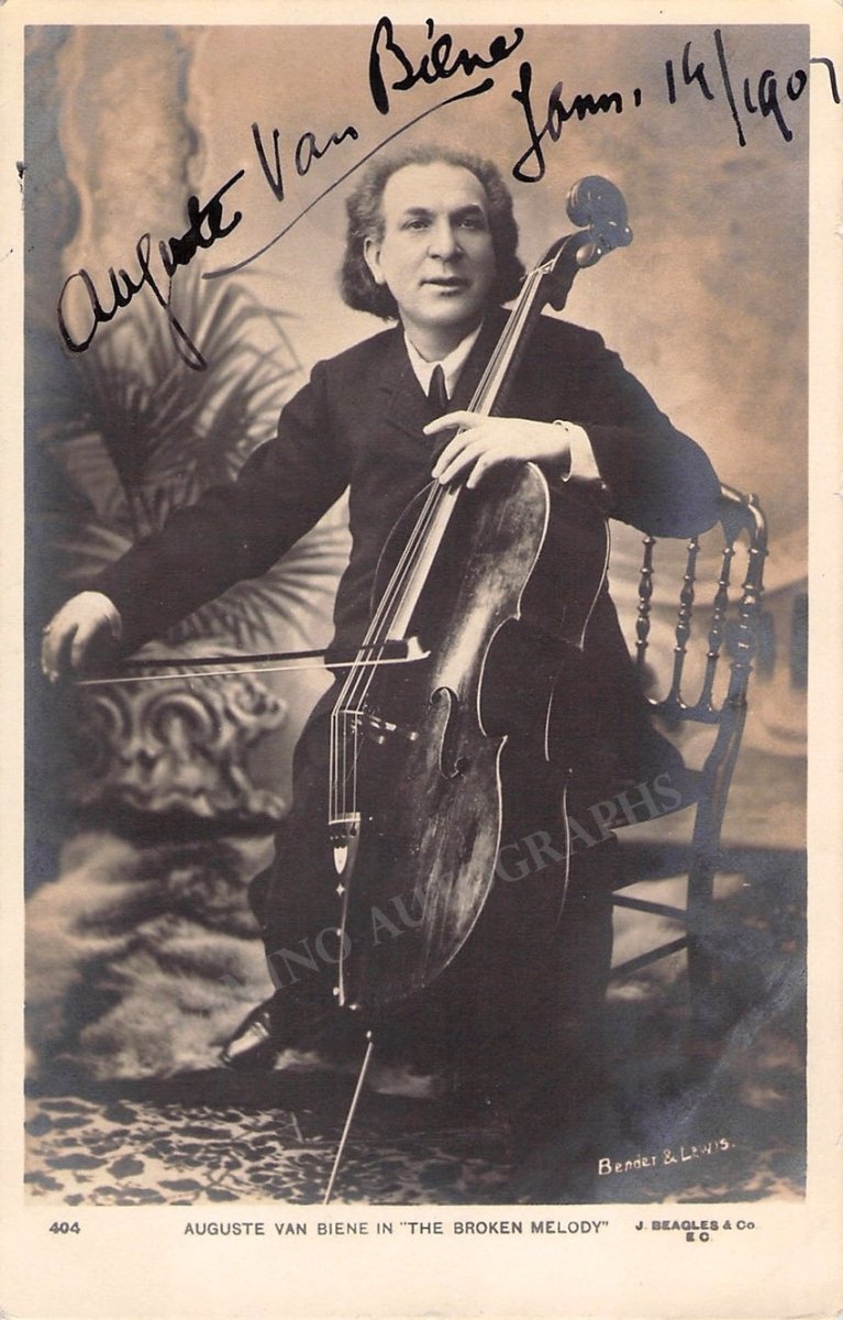 Famous Dutch cellist and composer (1849-1913), started performing in the streets and was discovered by Michael Costa who hired him for this Covent Garden Orchestra. Van Biene later performed with the best orchestras in Europe and developed a highly successful career, died on stage in performance. Signed photo postcard shown with his instrument, dated in 1907. Size is 3.5 x 5.5 inches, in excellent condition.