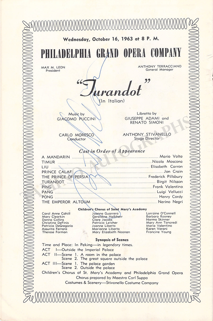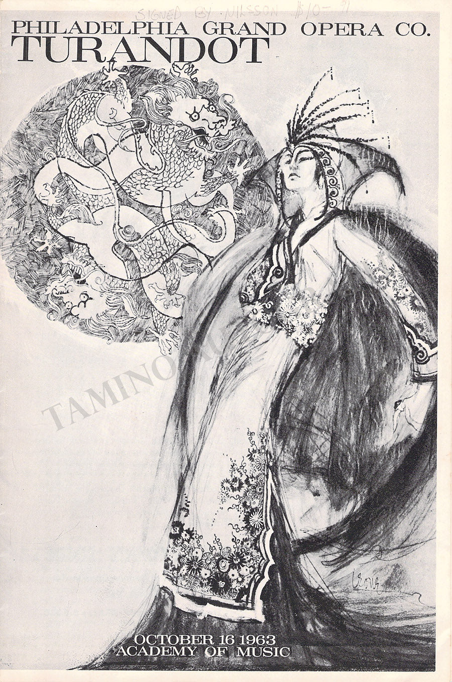 Program for a performance of Puccini's opera "Turandot" on October 16, 1963, by The Philadelphia Grand Opera Company signed by the star Swedish soprano on the cast page.