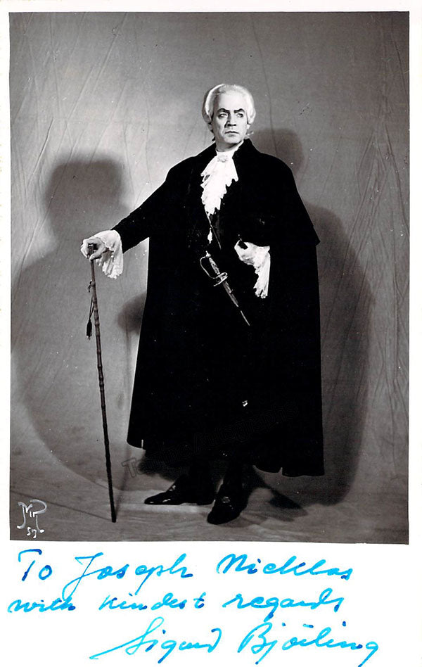 Swedish baritone (1907-1983), signed postcard photograph, shown as Scarpia in Puccini's Tosca, inscribed. Printed photographer signature on front, dated in 1957. Size is 3.5 x 5.5 inches, in excellent condition.