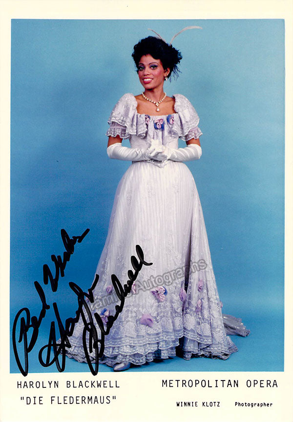 American soprano (b. 1955), signed photograph, shown as Adele in Johan Strauss's Die Fledermaus. Photo is by Winnie Klotz, Metropolitan Opera, New York. Size is 5 x 7 inches,in excellent condition.