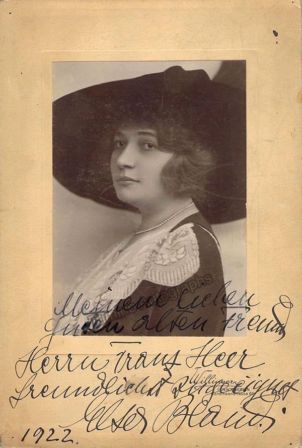 Austrian soprano (1880-1935), signed photo, shown as herself, extensively inscribed and dated in 1922. Photo by Willinger, Berlin. Photo size is 3.75 x 5.5 inches, mounted onto solid cardboard, total item size is 6 x 9 inches, very slight wear on edges, otherwise in excellent condition.