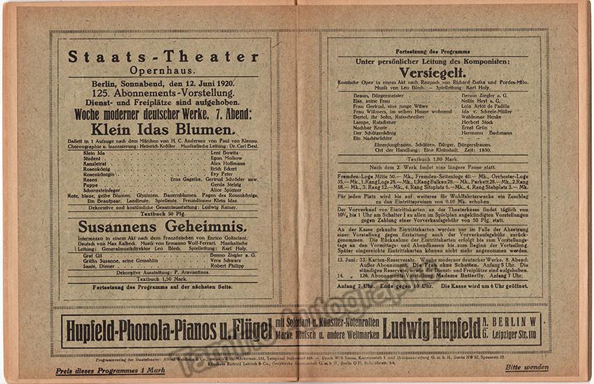 Opernhaus Berlin "Unter den Linden" - Week of German Modern Works. Berlin, June 20th, 1920 Leo Blech: "Versiegelt" (Komische Oper) with Benno Ziegler, Nellie Heyl, Lola Artot de Padilla, Ida v. Scheele-Muller. Ermanno Wolf-Ferrari: Susannens Geheimnis Paul von Klenau: Klein Idas Blumen (Ballet) (conducted by Carl Besi) Program, 56 pages, many illustrations and pictures, excellent to near mint condition.