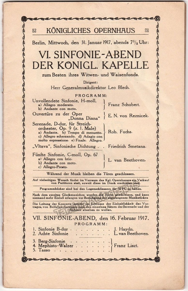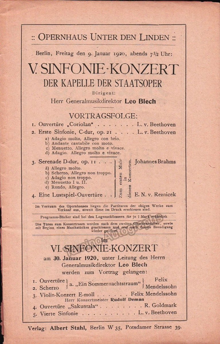 Set of 2 programs, Berlin 1917 and 1920, with Leo Blech as conductor. Jan 31st, 1917 is a program for a concert with music by Schubert, Reznicek, Fuchs, Smetana and Beethoven. Jan 9th, 1920 is a program with music by Beethoven, Brahms and Reznicek. Each program is complete with all pages and covers, 5.5 x 8.6 inches, in very good condition.