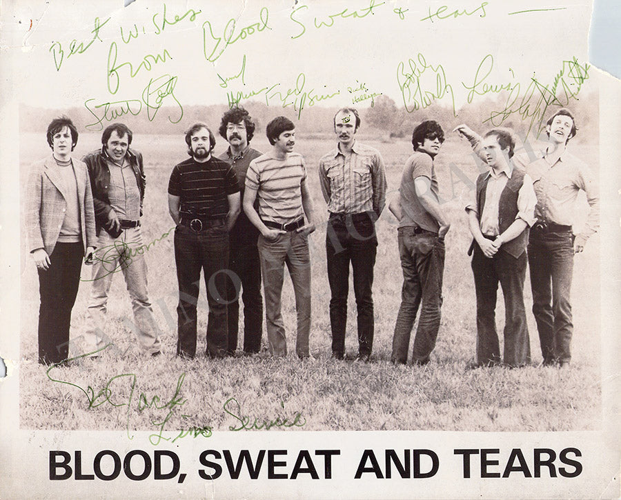 Sepia color promo photograph signed by nine members shown in the picture, including Steve Katz, David Clayton-Thomas, Bobby Colomby, Fred Lipsius Dick Halligan, and others. Size is 10 x 8 inches, some cracks, creases, and loss of paper over the upper and left borders, though signatures are clearly visible. Priced Accordingly.