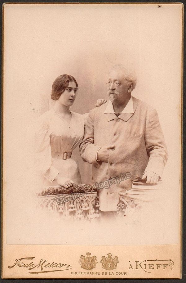 Beautiful cabinet photo signed and inscribed on verso with a short sentiment, shown next to her singing teacher, Belgian baritone Camille Everardi (1824-1899); photo by F. De Mezer, Kiev. Size is 4.25 x 6.5 inches, in excellent condition.