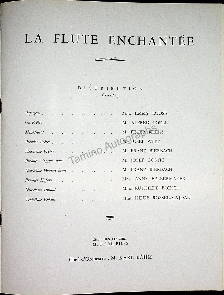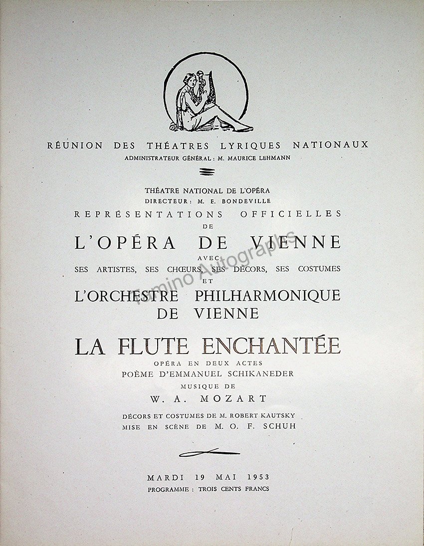 Full program with all pages and covers, with Karl Bohm conducting the Vienna Opera orchestra on tour in Paris, 1953, performance of Mozart´s opera "Die Zauberflote". Size is 8.25 x 10.5 inches, see scans of first page and cast page. In excellent condition.