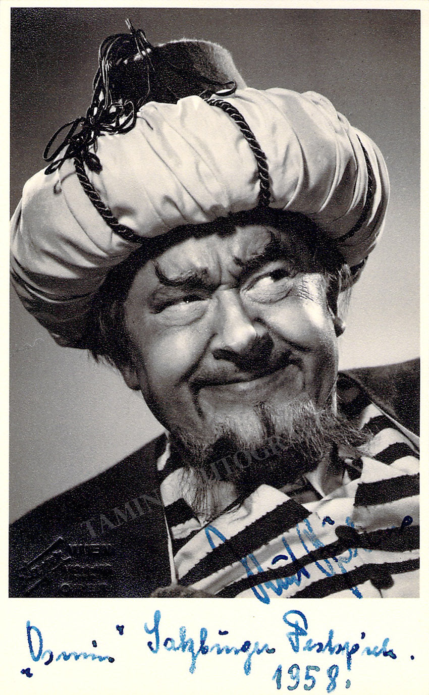 Signed postcard photograph, shown as Osmin in Mozart's Entfuhrung aus dem Serail, dated in 1958. Stamped on verso by Fayer photo studio, Vienna. Size is 3.25 x 5.25 inches, in excellent condition.
