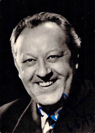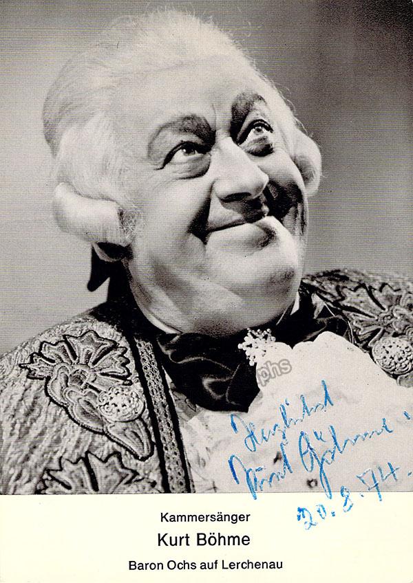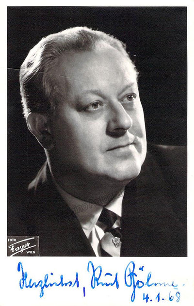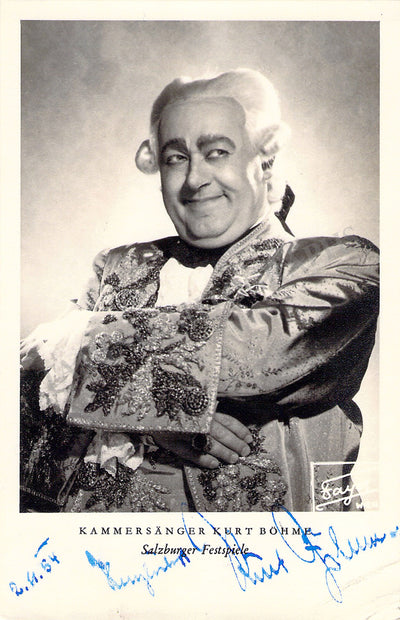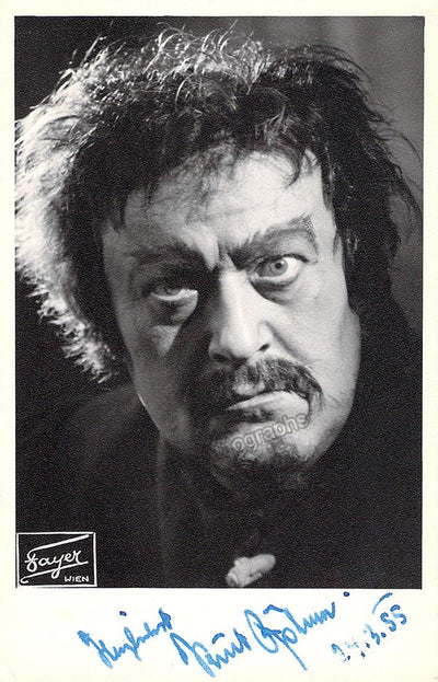 Signed photo postcard, shown as Baron Ochs in Richard Strauss's Der Rosenkavalier, dated in 1954. Stamped on verso by Fayer photo studio, Vienna. Size is 3.5 x 5.5 inches, mounting traces on verso, otherwise in excellent condition.