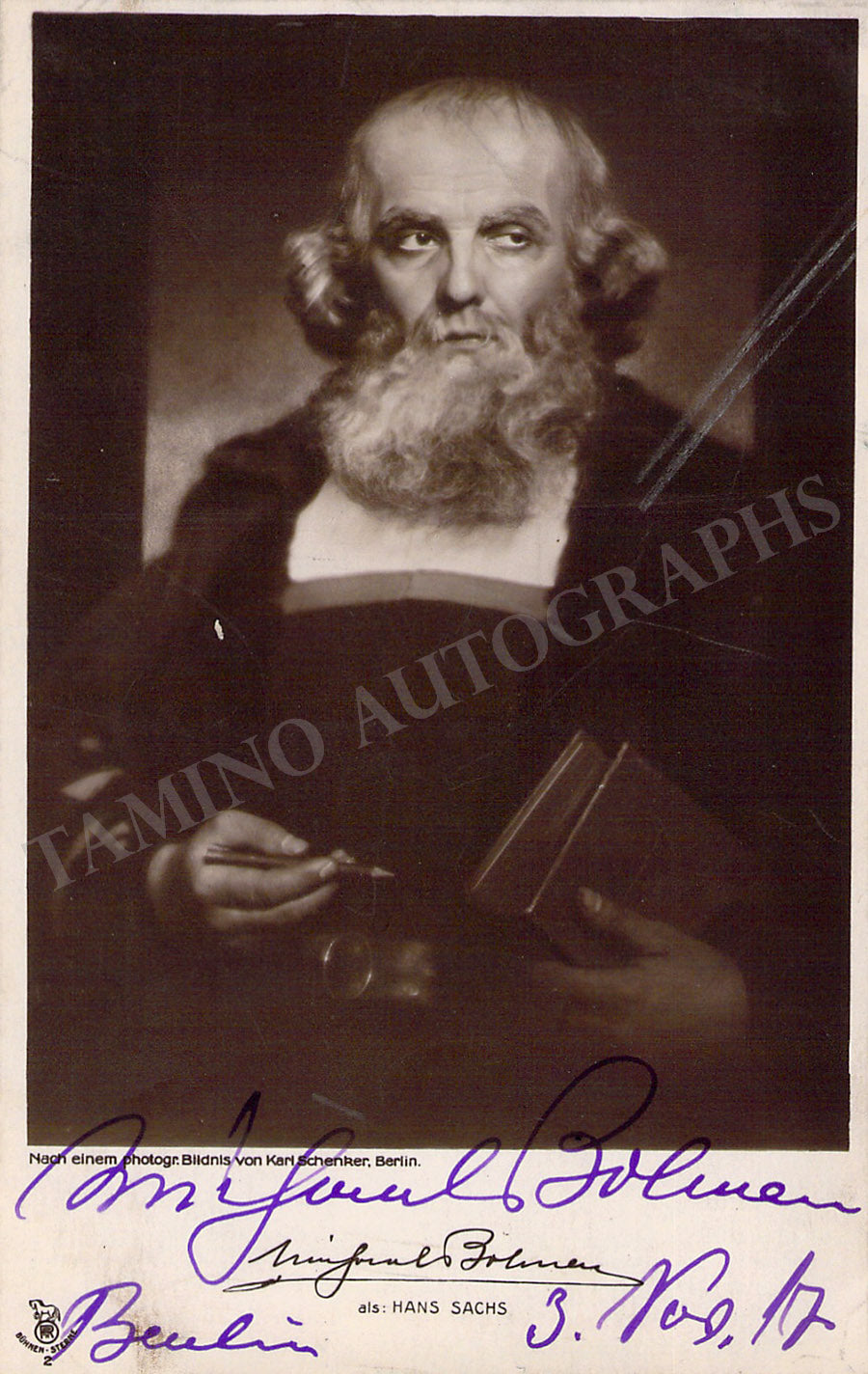 Signed black and white postcard photograph, shown as Hans Sachs in Wagner's Die Meistersinger, dated in 1917. Size is 3.4 x 5.3 inches, in excellent condition.