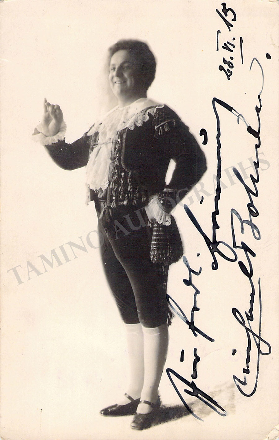Signed black and white postcard photograph, shown in role (possibly Mozart's Figaro), dated in 1915. Size is 3.4 x 5.4 inches, in excellent condition.