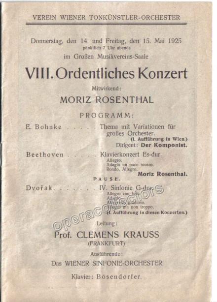 Vienna 15.05.1925 Wiener Sinfonie-Orchester, Cond: Clemens Krauss & Emil Bohnke - Soloist: Moriz Rosenthal E. Bohnke: Thema mit Variationen fur Grosses Orchester (1. Auffuhrung in Wien) (conductor: Emil Bohnke) Beethoven: Klavierkonzert Es-dur, Dvorak: IV. Sinfonie G-dur. Program: 12 pages, 14,5 cm x 20 cm