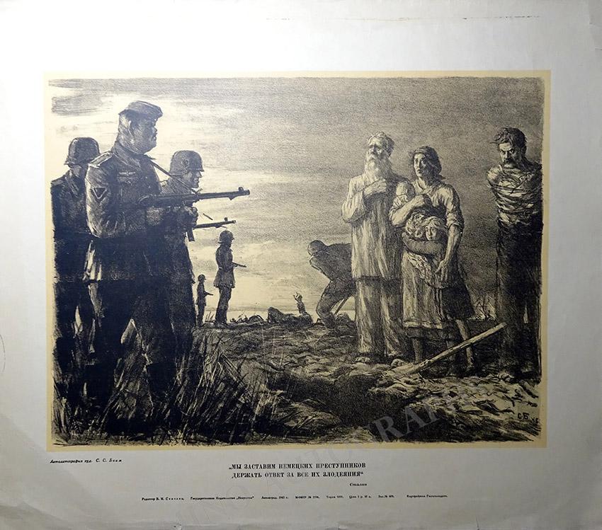 Russian artist of Jewish origin (1899-1978), known mostly for his widely recognized works in graphic techniques. Original lithograph, edition of 5000, size is 16.8 x 19.2 inches, in great condition. It reads below "We will hold German criminals responsible for all their evil doings", referring to German troops invading Russia and all the crimes committed there.