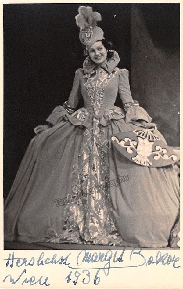 Hungarian soprano (1905-1949), signed photo postcard, shown in role. Signed and dated in Vienna in 1936. Size is 3.4 x 5.4 inches, in excellent condition.