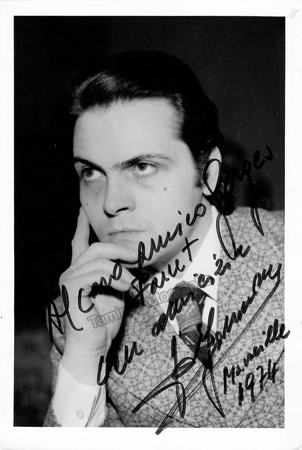 Italian tenor (b. 1938), signed photograph, shown as himself, inscribed and dated in Marseille in 1974. Size is 3.5 x 5 inches, in very good condition.