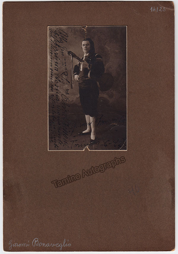 Italian baritone (1893-1962), signed vintage photograph, shown as Figaro in Rossini's Barbiere di Siviglia, inscribed with sentiment in Torino in 1927. This is a 3.25 x 5 inch postcard photo mounted on cardboard, total item size is 7 x 10.25 inches, small tears at very top and bottom of the photo, otherwise in very good condition.