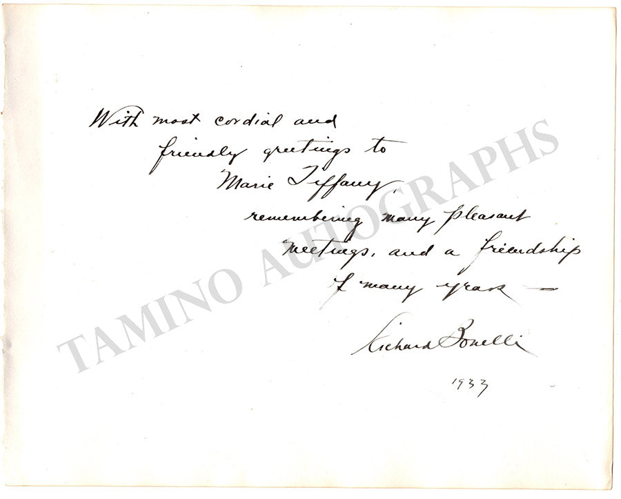 American baritone (1887-1980), signed album page, dated in 1933. Inscribed with short sentiment, bold handwriting and signature. Size is 9 x 11.75 inches, in excellent condition.