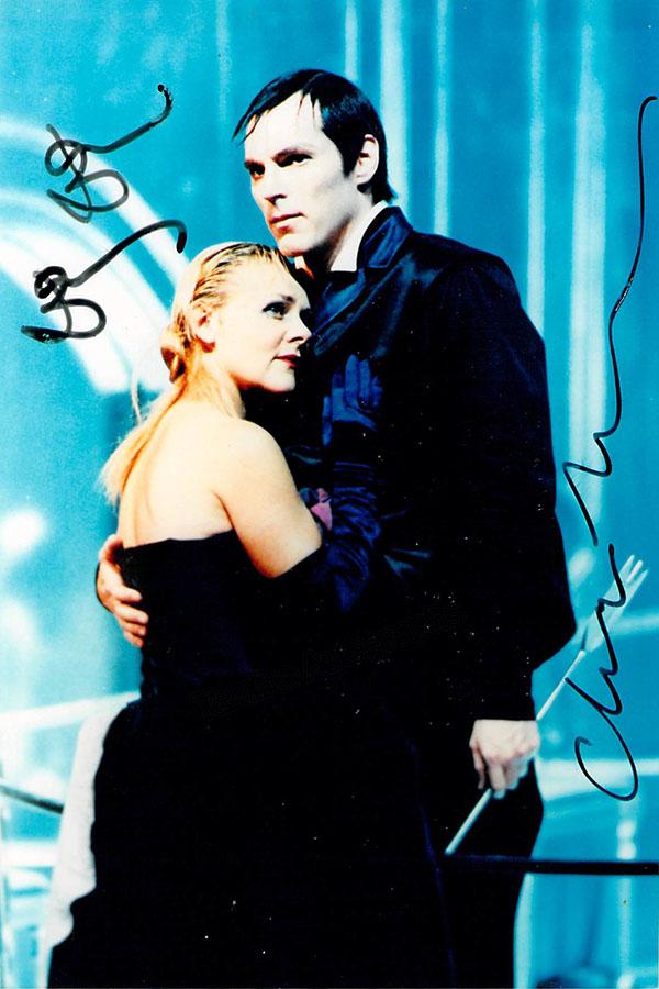 American soprano (b.1956) and American tenor (b. 1965?), double signed photograph, shown in role in Jean-Philippe Rameau's Les Boreades. Size is 4 x 6 inches, in excellent condition.