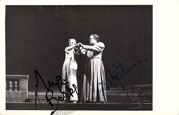 Double signed postcard photograph, shown in roles in Werner Egk's opera Irische Legende, an opera which they both performed in the opera's world premiere production at the Salzburg festival in 1955. Blind stamped on front by photographer Ellinger, Salzburg. Size is 3.5 x 5.5 inches, in excellent condition.