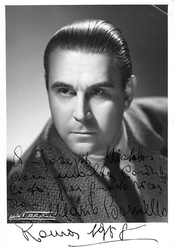 Italian baritone (1914-2000), signed photograph, shown as himself, inscribed and signed in Rome, dated in 1958. Stamped on verso by photographer Villani, Bologna. Size is 5 x 7 inches, small creases on top and bottom right corners, otherwise in excellent condition.