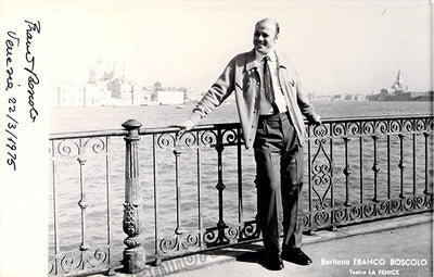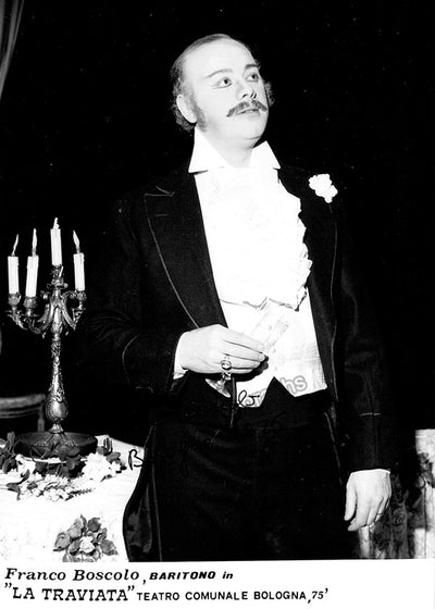 Signed photograph, shown as Germont in Verdi's La Traviata, dated in Bologna in 1975. Stamped on verso by photographer Franco Tiralongo, Bologna. Size is 5 x 7 inches, in excellent condition.