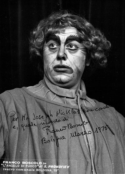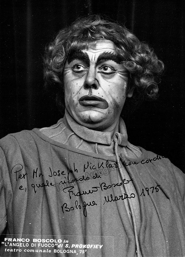 Signed photograph, shown in role in Prokofiev's Fiery Angel, inscribed and dated in Bologna in 1975. Stamped on verso by photographer Ermanno Reberschak, Venice. Size is 5 x 7 inches, in excellent condition.
