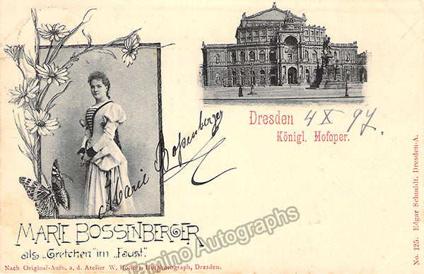 German soprano (1871-1919), signed postcard photograph, shown as Marguerite in Gounod's Faust. Photo by W. Hoffert photo studio, Dresden. Size is 3.25 x 5.5 inches, in excellent condition.