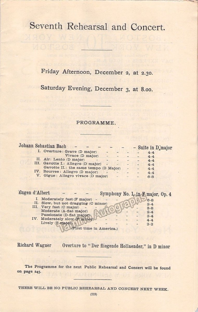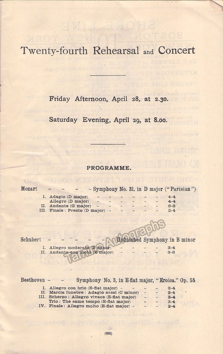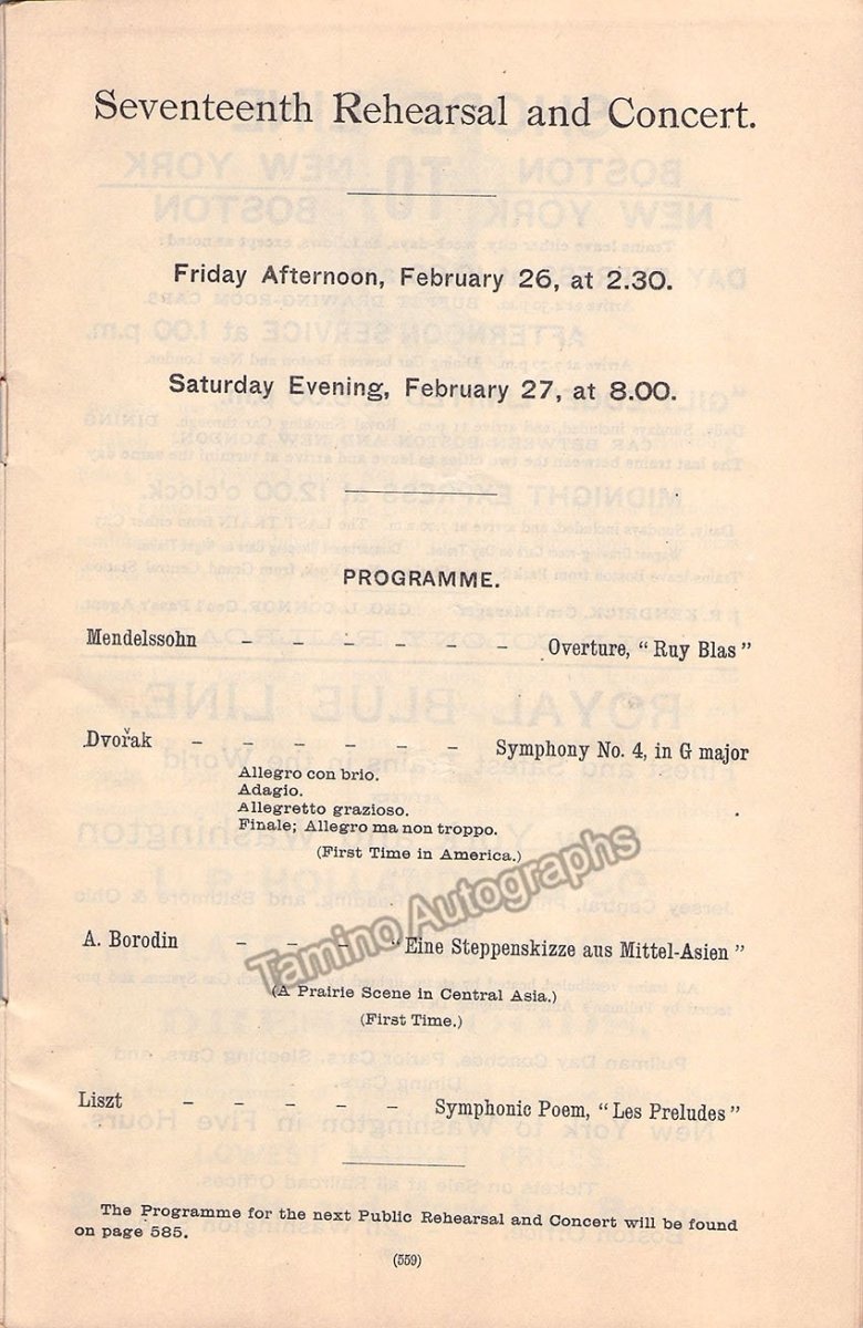 Lot of 4 full programs with Arthur Nikisch conducting the Boston Symphony Orchestra, seasons 1891-92 (1 program) and 1892-93 (3 programs). Complete, with all pages and covers, in excellent condition. Announcements of recitals and concerts by important performers on the back. Excellent condition, see scans.