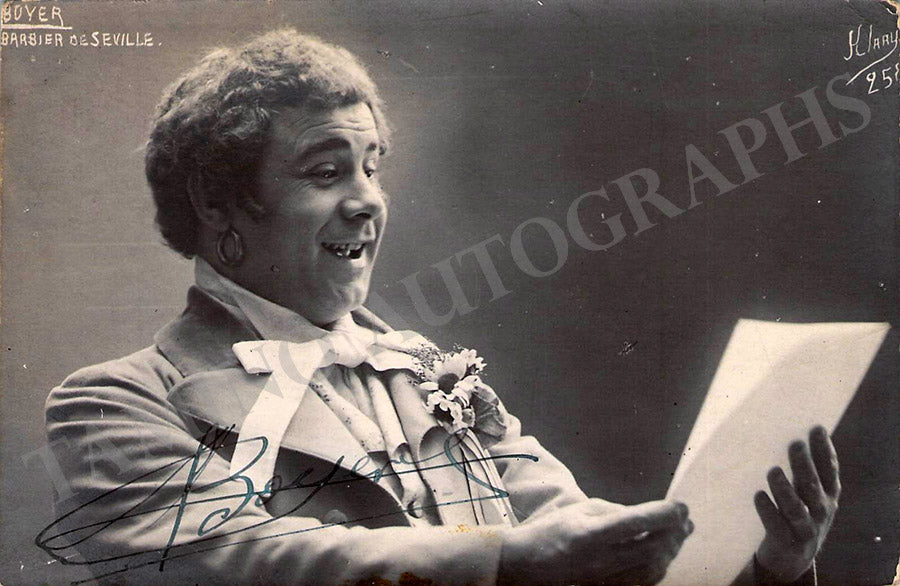 French baritone (1876-1954), signed postcard photograph, shown as Figaro in Rossini's Barbiere di Siviglia. Photo by Klary. Size is 3.5 x 5.25 inches, small creases and bends, otherwise in very good condition.