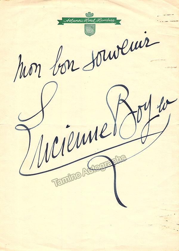 French singer (1901-1983) and diseuse (teller/narrator), signed page with a letterhead from a hotel, with a short sentiment in French. Size is 6 x 8.25 inches, in very good condition.