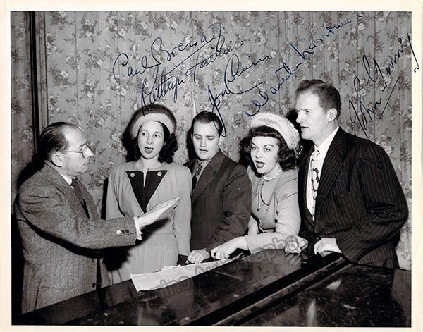 Photograph with 5 signatures - the cast and conductor of the "Night in Vienna" group, shown in rehearsal, from left to right, musical director Paul Breisach, soprano Kathryn Poirier, tenor Jon Crain, contralto Martha Larrimore, and bass John Gurney. Size is 8 x 10 inches, small creases on top and bottom right, otherwise in every condition.