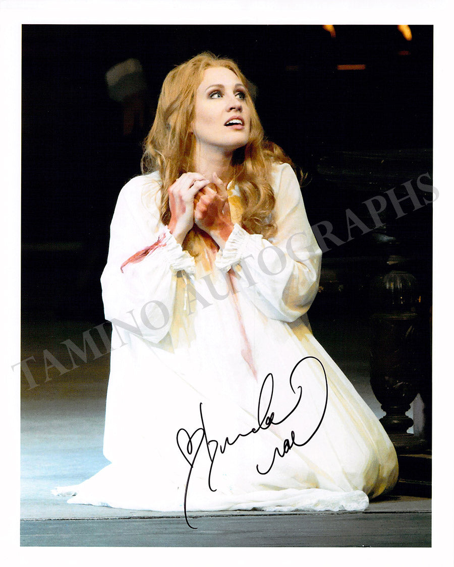 Nice color photograph signed by her, shown during the mad scene in Donizetti's opera Lucia di Lammermoor. Size is 7.9 x 9.9 inches, in excellent condition.