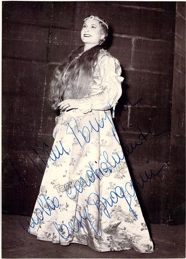 Signed photograph, shown as Nedda in Leoncavallo's I Pagliacci at La Scala, Milan. Photo by E. Piccagliani, La Scala, Milan. Size is 4 x 6 inches, in excellent condition.