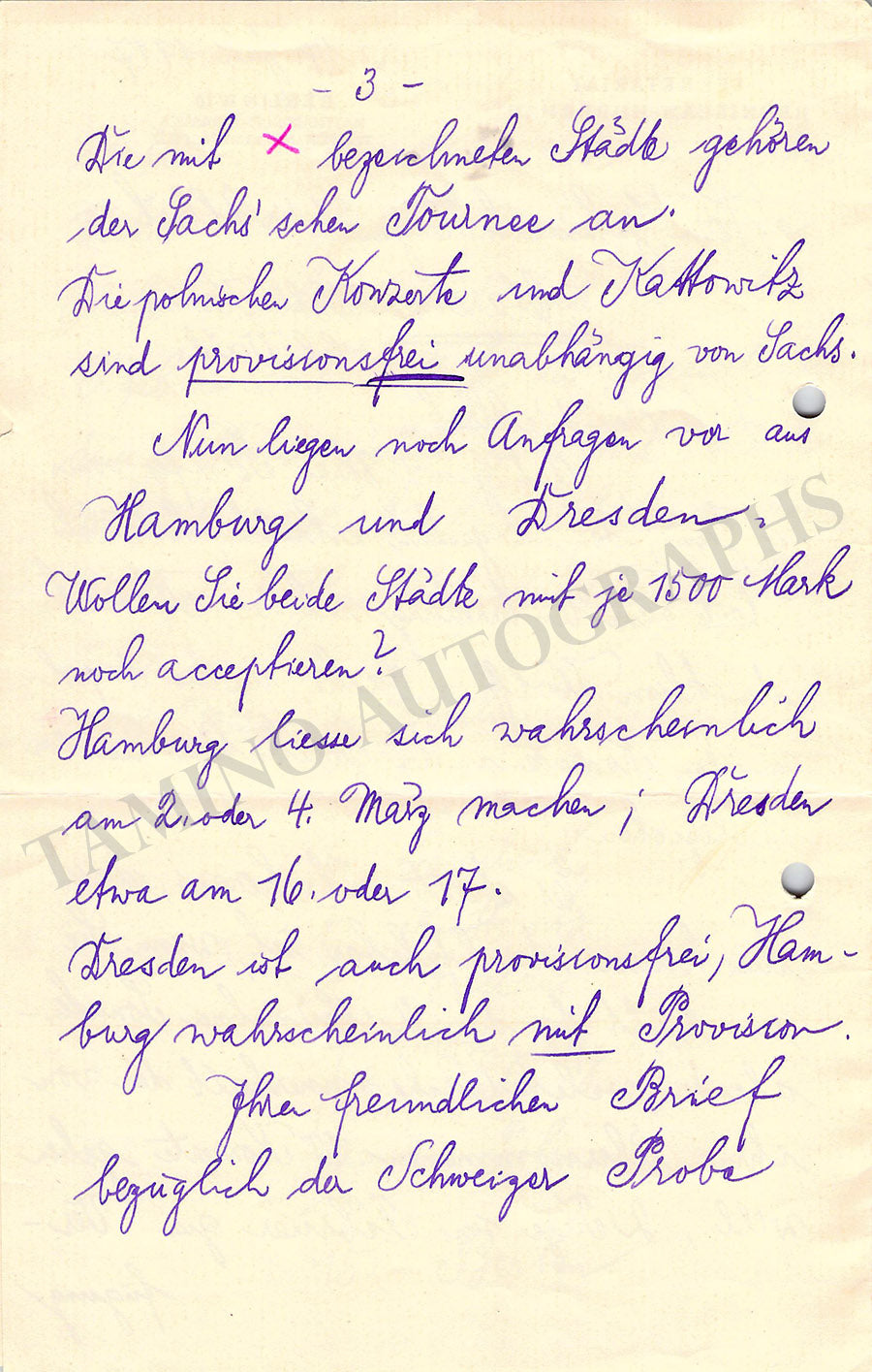 “… Based on your letter of June 9, which I received yesterday, I had a conversation today with the concert director Wolff-Sachs to include the 3 Polish concerts in the sonata tour. It turned out that this is hardly feasible if you do not give us 2 days in February for the 2 Munich sonata evenings, which Sachs wants to give within the 10 concerts he has taken over. I want to spare you with the individual dates and hall commissions in this matter and share only the result. Provided that it will be possible for you to schedule the 2 Munich Sonata evenings earlier, I propose the following data plan to you…”.