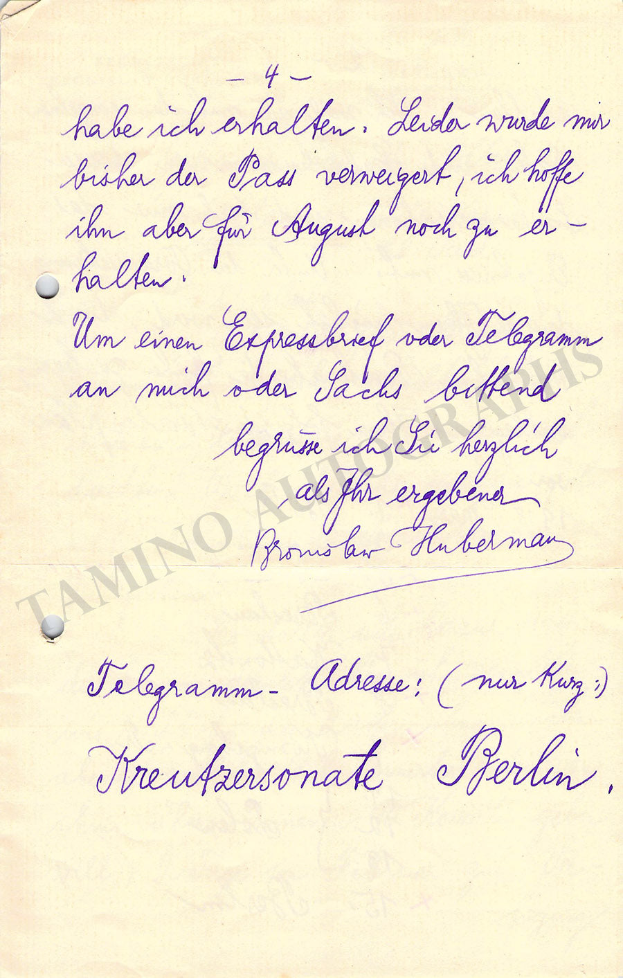 Huberman, Bronislav - Autograph Letter Signed 1917 Huberman, Bronislav - Autograph Letter Signed 1917 Huberman, Bronislav - Autograph Letter Signed 1917