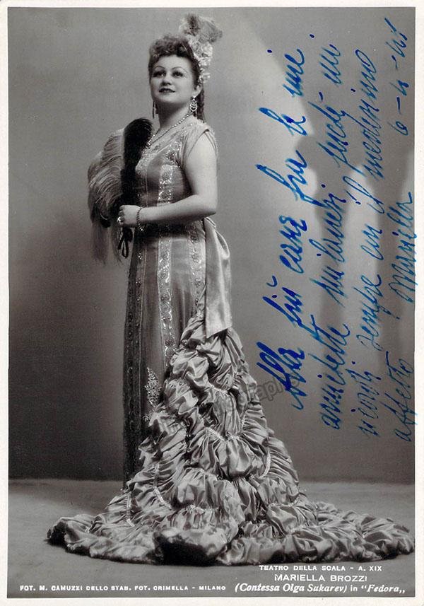 Italian soprano, signed photograph, shown as Countess Olga Sukarev in Giordano's Fedora, inscribed and dated in 1944, signed as "Mariella". Photo by M. Camuzzi, La Scala, Milan. Size is 4 x 5.75 inches, in excellent condition.