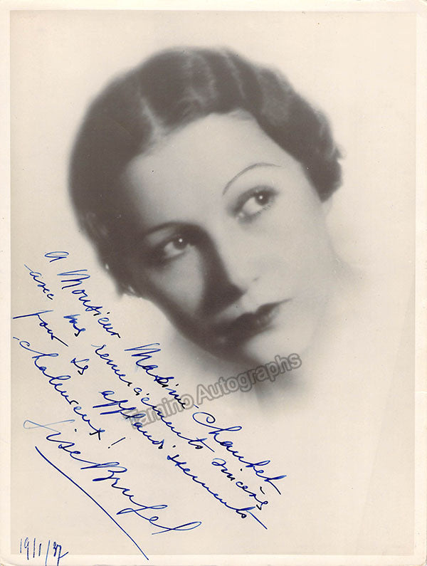 French soprano (1908-2003), signed photograph, shown as herself, inscribed with sentiment, dated in 1937. Size is 7 x 9.25 inches, several small creases but otherwise in excellent condition.