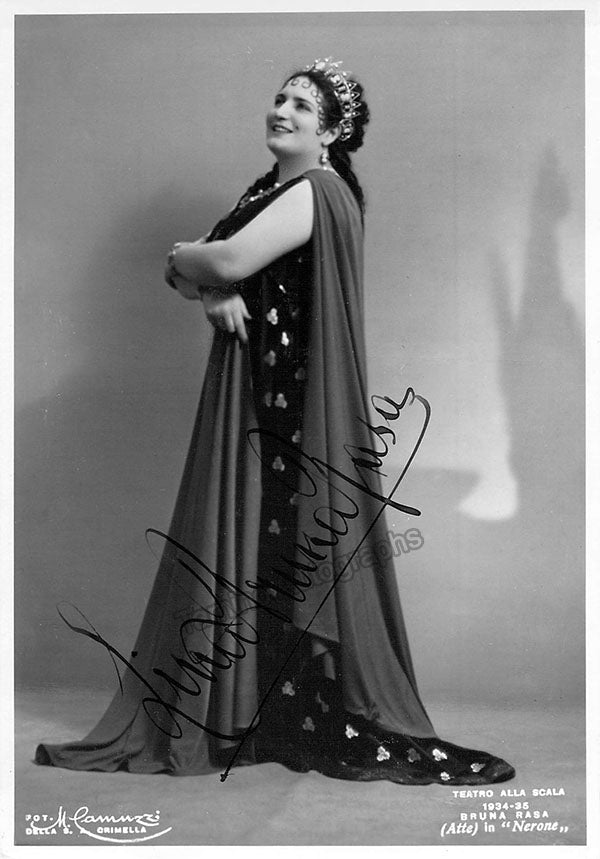 Italian soprano (1907-1984), who excelled in the verismo repertoire, was the favorite Santuzza in Cavalleria Rusticana of the opera's composer Pietro Mascagni. Signed postcard photograph, shown as Atte in Boito's Nerone. Printed signature on front of photographer M. Camuzzi, La Scala, Milan. Size is 4 x 5.75 inches, in excellent condition.