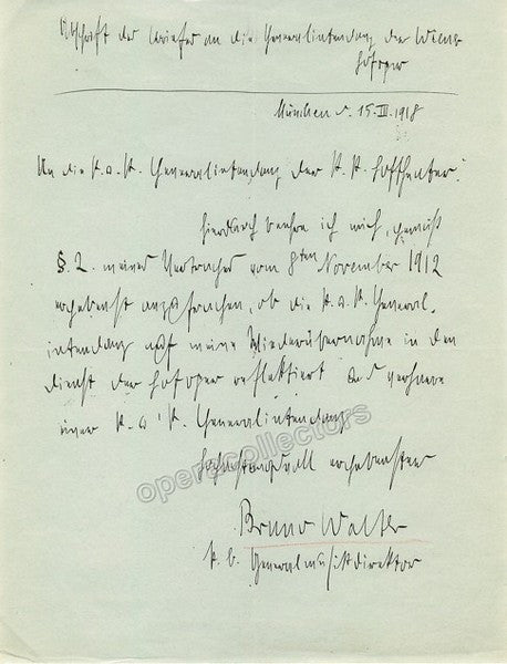 Autograph letter signed by the great German conductor (1876-1962), in German, dated in Munich on March 15th, 1918. Sold untranslated, letter refers to a letter by Walter to the direction of the Vienna Staatsoper about some elements in his contract with the Vienna opera in 1912. One page, handwritten and signed on one side only, 7.75 x 10 inches, in excellent condition