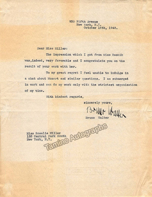 Typed letter in English signed by him and dated in New York, October 16, 1942, about his impressions from hearing the young soprano Regina Resnik. Size is 8.4 x 10.9 inches, overall rust tone, central fold, in good condition.