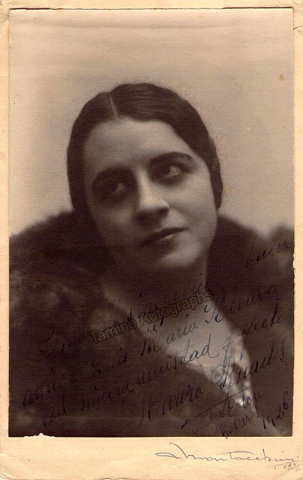 Signed photograph, shown as herself, inscribed at the Teatro Colon, Buenos Aires, dated in 1928. 4.5 x 6.75 inch postcard-size photo is mounted on soft cardboard paper, total size of item is 4.75 x 7.5 inches. Some wear on top and bottom edges of the cardboard, outside of the photo area, photo itself has tiny amount of missing paper at bottom left, but is in otherwise excellent condition.
