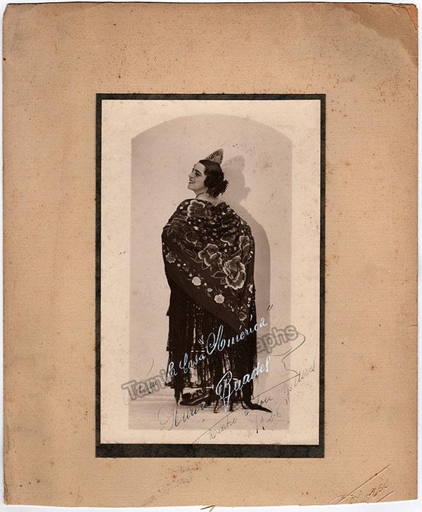 Large signed photo shown as Carmen in Bizet's opera, inscribed to record store 'Casa America', dated in Buenos Aires, 1926. Photo is mounted on a photographer mat trimmed at the bottom. Some white ink overwriting over part of inscription and signature. Total size is 11 x 13.5 inches, photo is 5.9 x 9.1 inches, spotted rust, water stains over upper right corner, in fair condition.