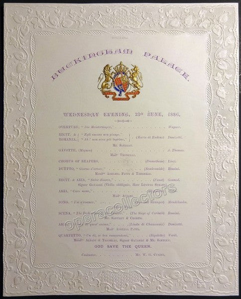 Beautiful program for a concert at Buckingham Palace, June 23rd 1886. Singers were, among others, star sopranos Adelina Patti and Emma Albani, plus star Spanish tenor Julian Gayarre (who could not sing that day due to sickness, as mentioned in a short note attached to the back). English baritone Charles Santley, French mezzo- Zelia Trebelli and Irish bass Allan J. Foli complete the cast. In superb condition, 7.5 x 9 inches, beautifully printed in relief in quality paper - very rare!