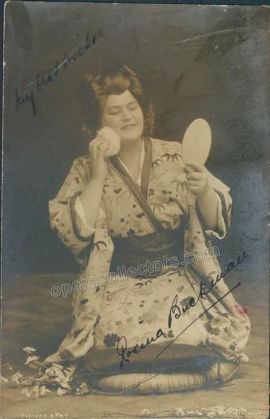 Signed photo postcard of the New Zealand-born soprano (1880-1948), shown as Suzuki in Madama Butterfly. Size is 3.5 x 5.5 inches, small crease and some silvering, otherwise in good condition - rare!.