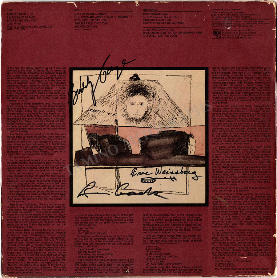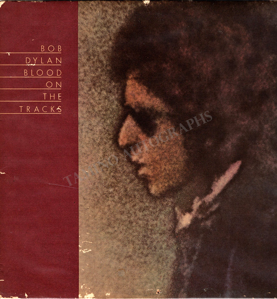 LP record sleeve for the album "Bob Dylan Blood on the Tracks" (1975) signed by both artists on verso plus one unidentified signer.  Size is 12.25 x 12.25 inches, in very good condition.