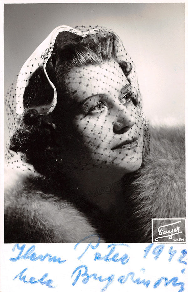Yugoslavian soprano (1903-1986), signed postcard photograph, shown as herself, dated in 1942. Stamped on verso by photographer Fayer, Vienna. Size is 3.5 x 5.25 inches, mounting tape traces on verso, otherwise in excellent condition.