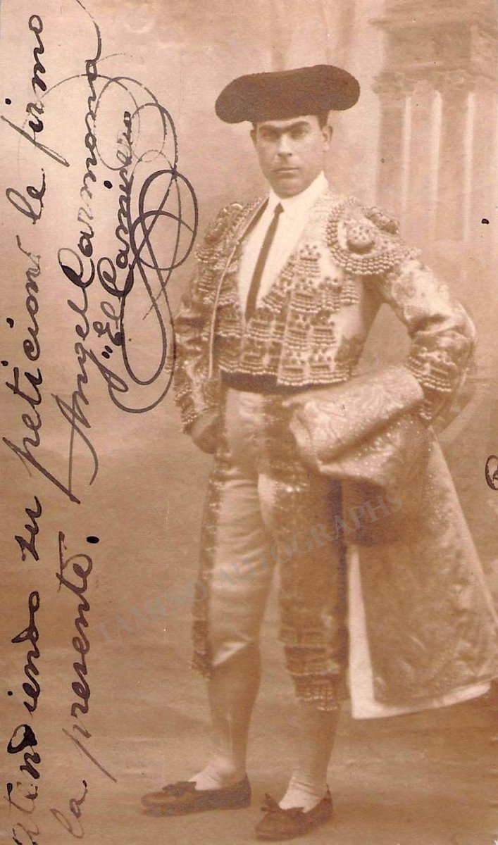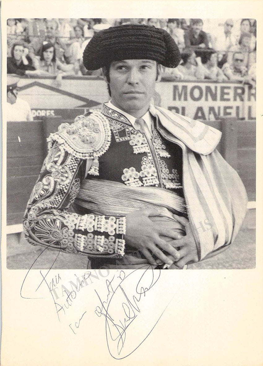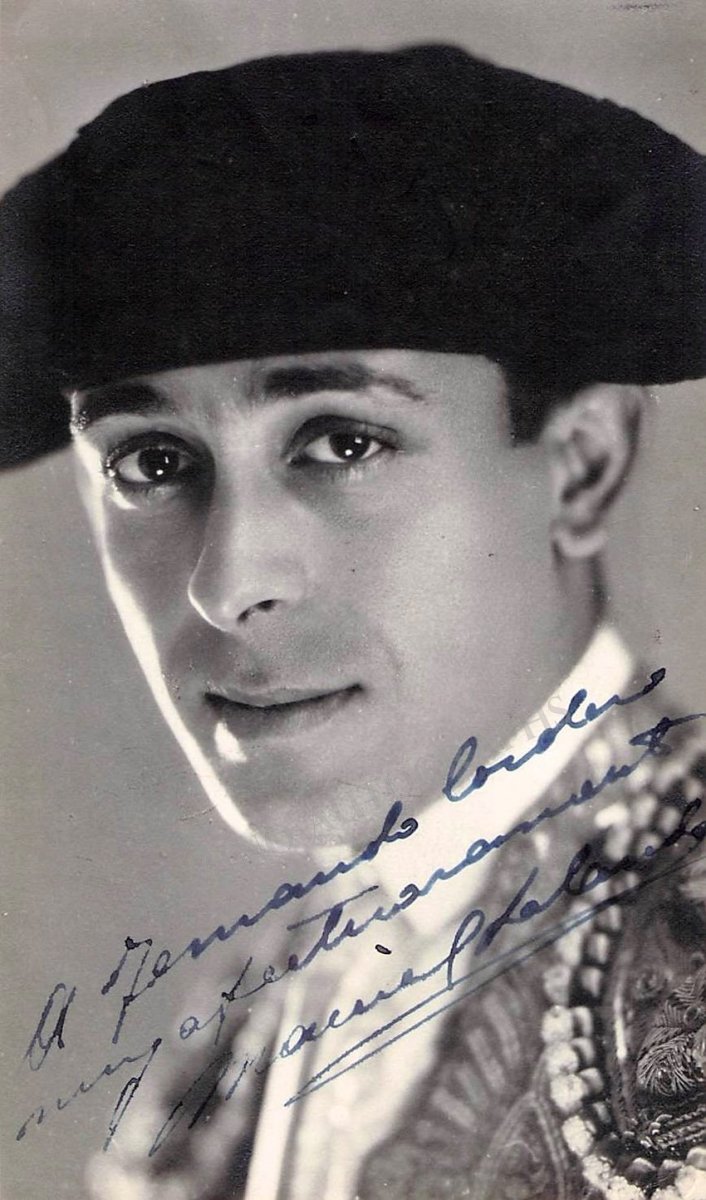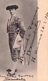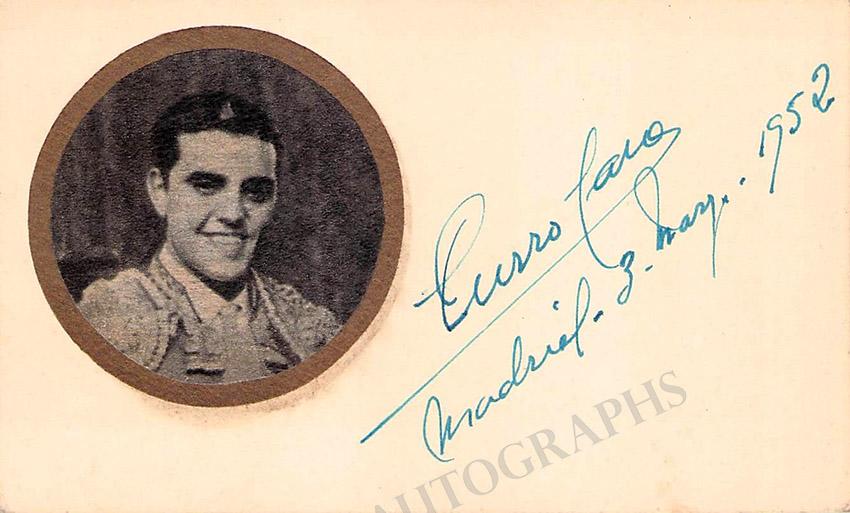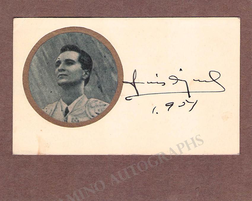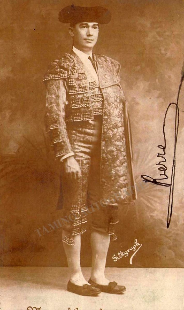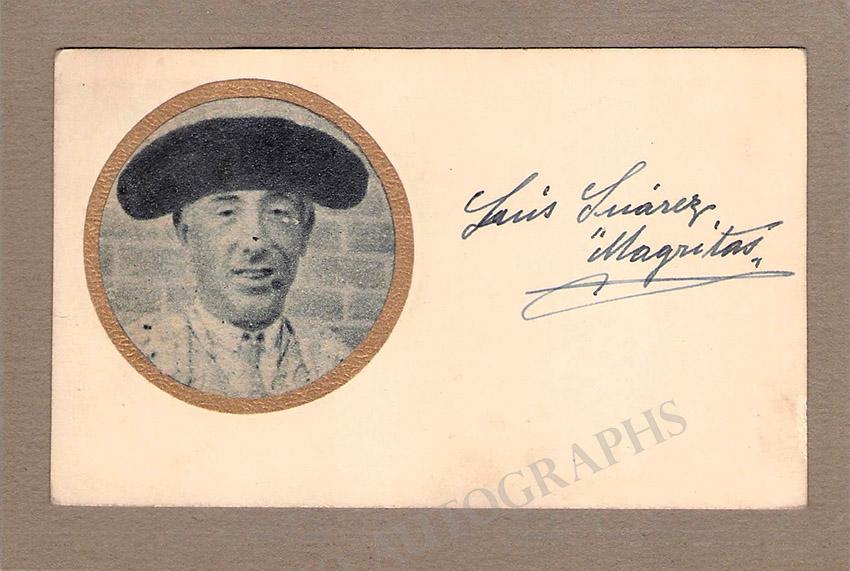Rare collection of 21 autograph photos and cards, each signed by a famous Spanish bullfighter. Full list includes: Angel Carmona ("El Carnicero" or "The Butcher"), Antonio Bienvenida, Antonio Fuentes, Antonio Marquez, Juan Bienvenida, Luis Gomez Calleja, Luis Miguel Dominguin, Luis Suarez ("Magritas"), Manuel Garcia ("Revertito"), Manuel Gonzalez, Manuel Jimenez ("Chicuelo"), Manuel Mejias, Manuel Torres ("Bombita"), Marcial Lalanda, Martin Francisco Caro ("Curro Caro"), Rafael Gonzalez Madrid ("Machaquito"), Raul Ochoa Rovira, Ricardo Torres Reina, Sebastián Silvan ("El Chispa"), Vicente Pastor and Gregorio Tebar ("El Inclusero"). Varios sizes, with most being postcard size, cards are 4.5 x 2.6 inches, all in very good condition. A rare, quite unique set!